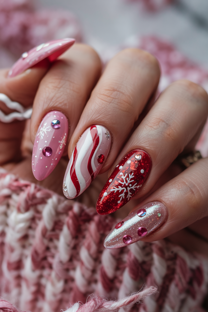 These nails are practically a sweet holiday treat. With their pink, red, and silver bases, the candy cane stripes, snowflake, and rhinestone accents create a festive design that sparkles with personality. It feels fun, playful, and perfect for December celebrations.