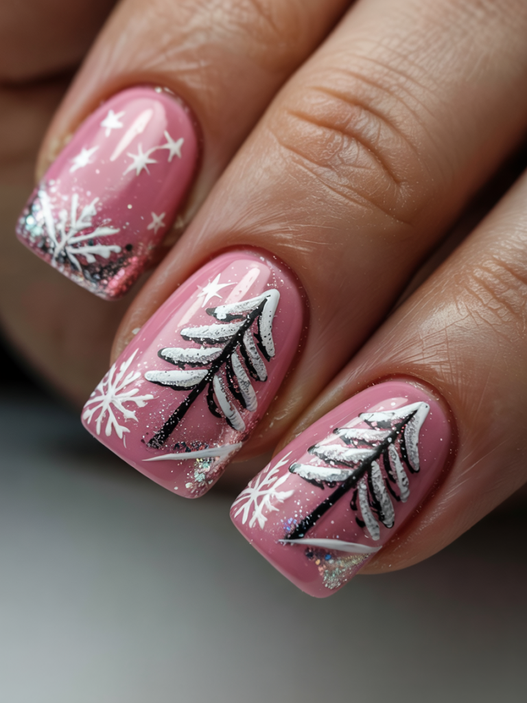 This one brings new ideas onto holiday nails. Pink base with glittery Christmas trees and snowflakes for whimsical and classy vibes. The sparkle catches light beautifully and gives the nails the magical glow of the holiday season.
