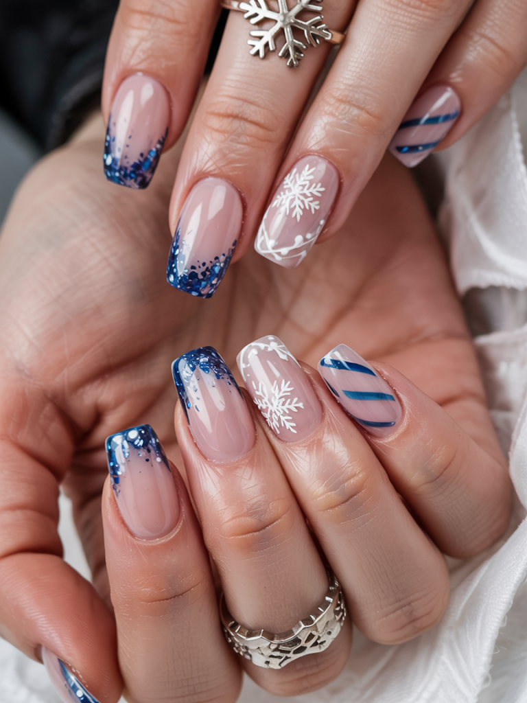 These nails combine classic French tips with a winter twist. The blue glittery tips are bold and eye-catching, while snowflake and stripe accents add festive charm. It’s a modern look that feels classy and unique.