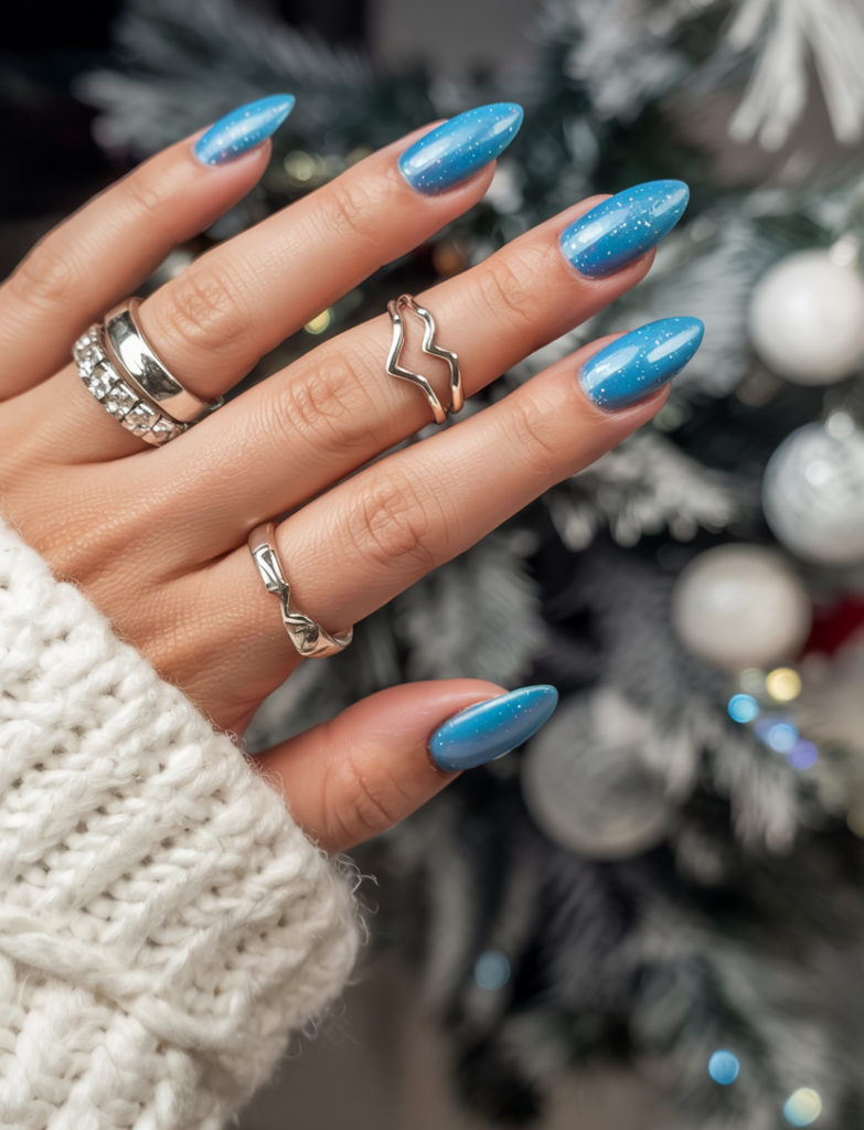 Almond nails provide a fantastic basis for the design, especially for women seeking classy inspiration in unusual shades. This design is minimalistic yet classy enough to go with cozy sweater weather or evening outings. An excellent pick for anybody who loves to rock blue nails during winter.