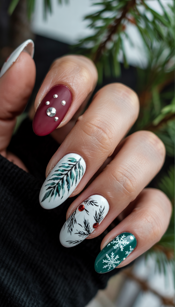 This design is ideal for almond nails and suits women who love subtle yet striking holiday nails. The silver accent adds sparkle, while the matte burgundy keeps it classy. It’s a versatile style that looks festive for Christmas but refined enough to wear throughout December.