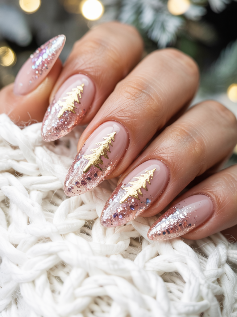 Nothing says Christmas quite like a decorated tree, and these nails capture that festive joy beautifully. A base of blush pink transitions into sparkling glitter, while golden trees stand tall as the stars of this design. It’s chic, sparkly, and full of seasonal charm—perfect for December celebrations.