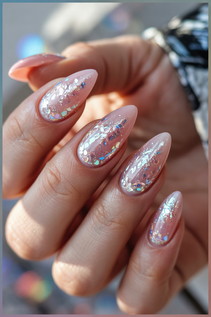 These nails look like frozen crystals catching the light, with iridescent flakes scattered across a soft pink base. The result is a shimmering, icy design that feels both subtle and magical. It’s an artful way to embrace the winter season without going overly traditional.
