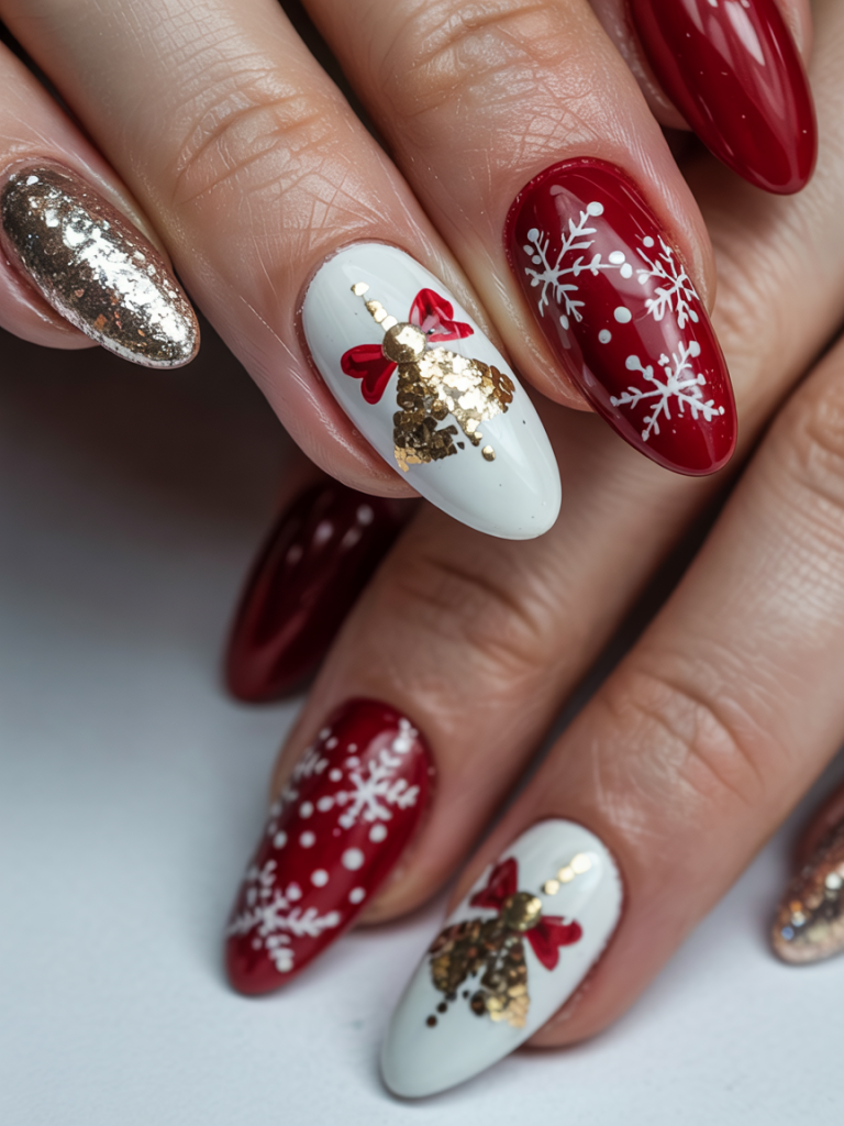 This design suits almond nails beautifully and works well for anyone who loves traditional holiday colors. The mix of red, white, and gold designs adds dimension while keeping it classy. Easy to pair with cozy sweaters or festive dresses, these holiday nails are versatile enough for both simple family gatherings and more formal Christmas parties.