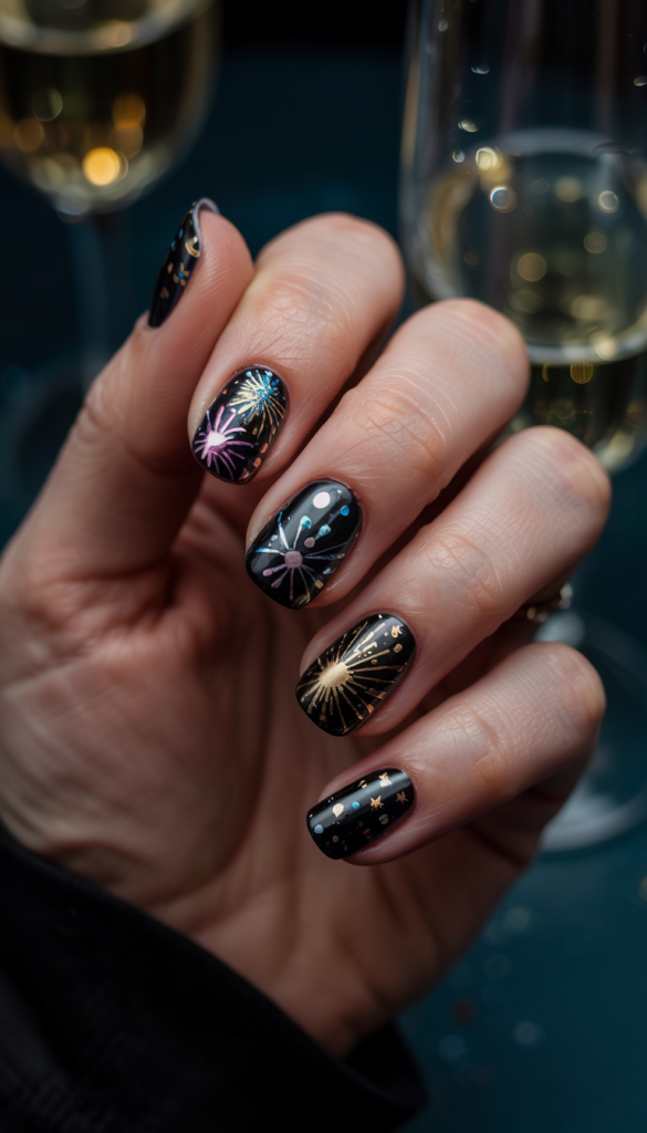 These nails are pure celebration. Against a sleek black base, colorful fireworks burst across the design in pink, gold, and blue, creating a look that feels alive with festivity. It’s the ultimate way to capture the spirit of New Year’s Eve on your fingertips.