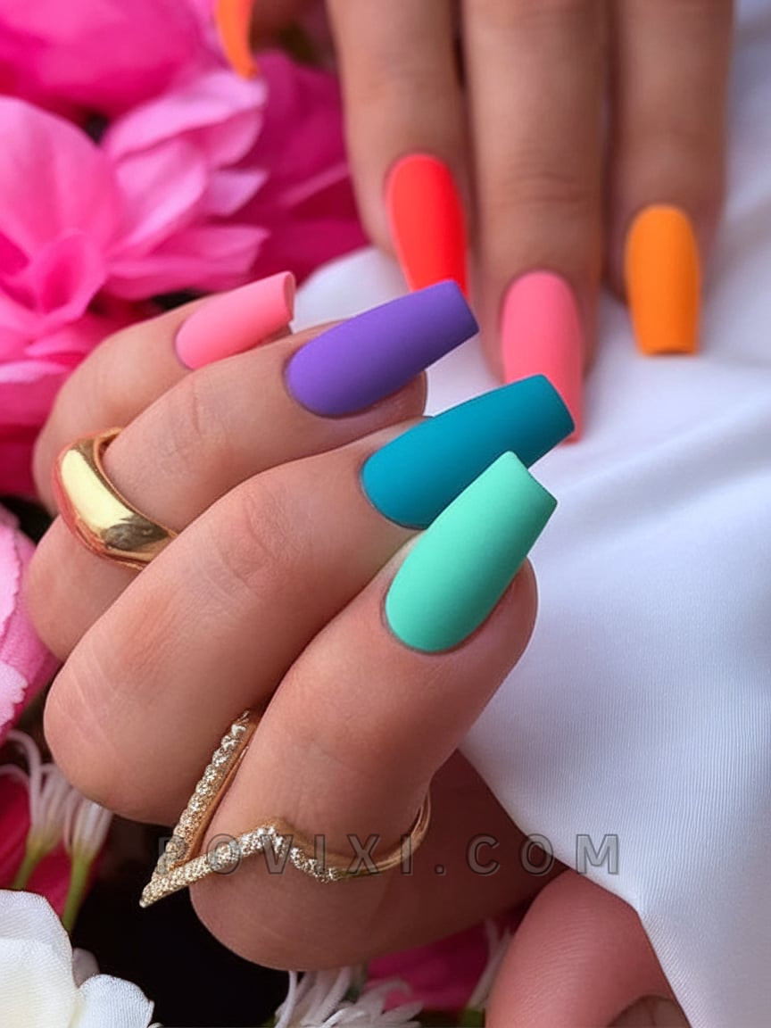 Let’s start with a splash of color. This nail set features matte colors like orange, coral and green, blue and purple, allowing you to turn all your nails into a joyful celebration. The square nail shape adds an unexpected edge to an otherwise vibrant color arrangement. The neon nail design creates a fun Miami experience that brings a party atmosphere to your hands. The nail style presents modern matte solid color statements that any woman who loves bold fashion will adore.
