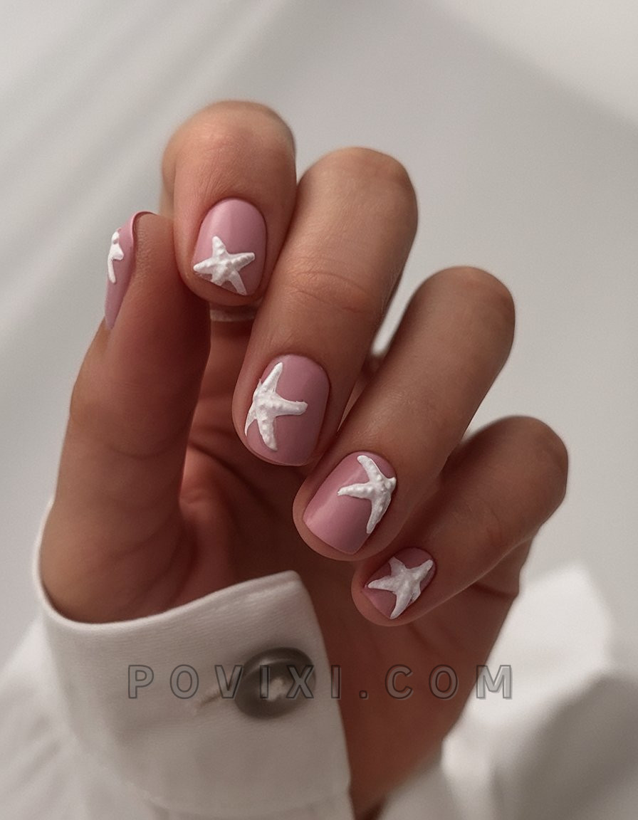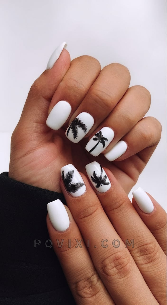 This design features all white nails decorated with black cut out palm trees. It gives a minimalist island getaway. Fashion lovers of beach life will find this design particularly attractive in 2025. A flawless contrast creates a sophisticated look, while square nails provide a stylish and endlessly fashionable look. This style is for the person who wants holiday elegance but is looking for something more sophisticated.