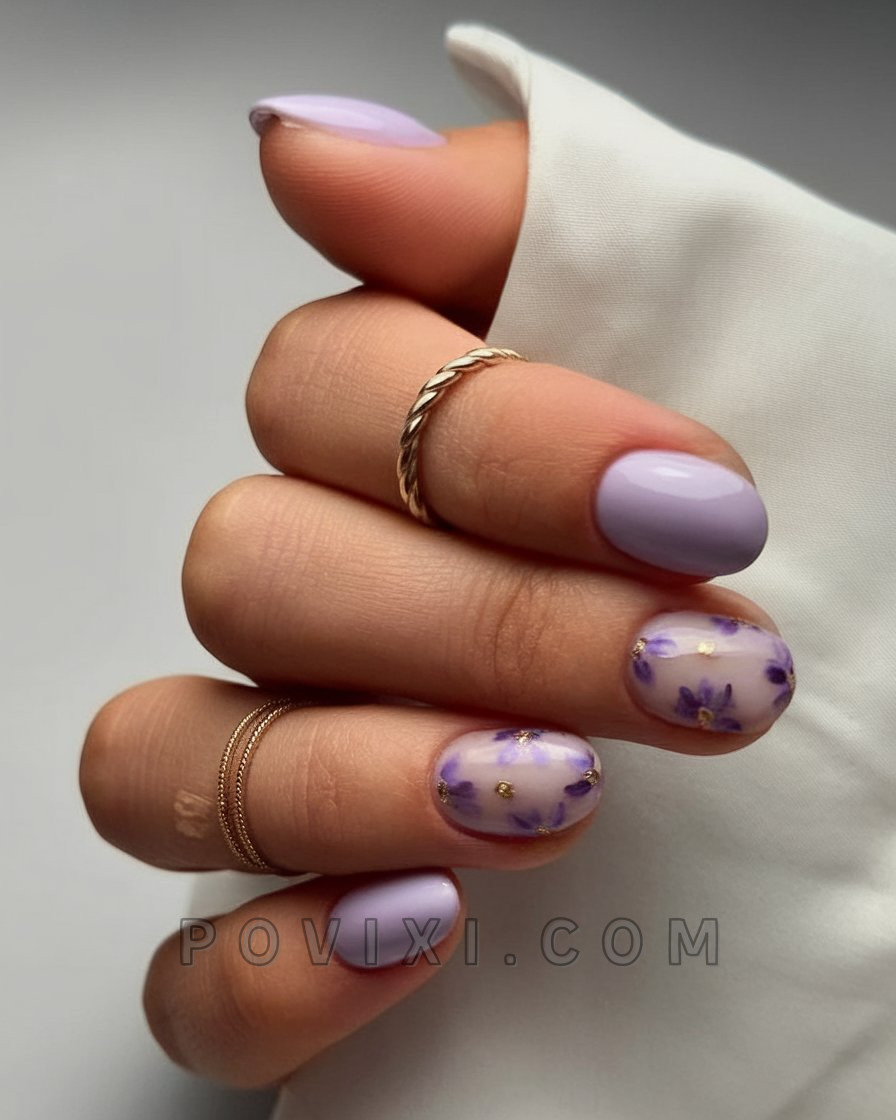 Nails adorned with dainty purple flowers between full color bases and gold speckles create a soft lilac look as described in this description. The floral designs on this oval nail shape provide a soft femininity that is suitable for both professional work environments and weekend social gatherings. This nail design stands out as the best choice for people who want almond pink nail designs in cool tones and delicate color arrangements that create an upscale look.