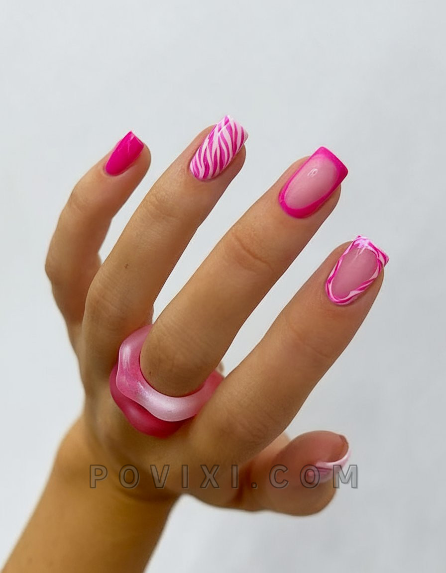 Bold encounters editorial style in this special design. The hot pink mix with zebra stripes, reverse french tips along with solid colors delivers a fashionable fun set that captures the ideas 2025 short trend. This design is for edgy, fashion-forward women who want pattern and texture combinations in their short and modern nail style. The hot pink mix is an excellent choice for confident and playful women who want to shine this summer.