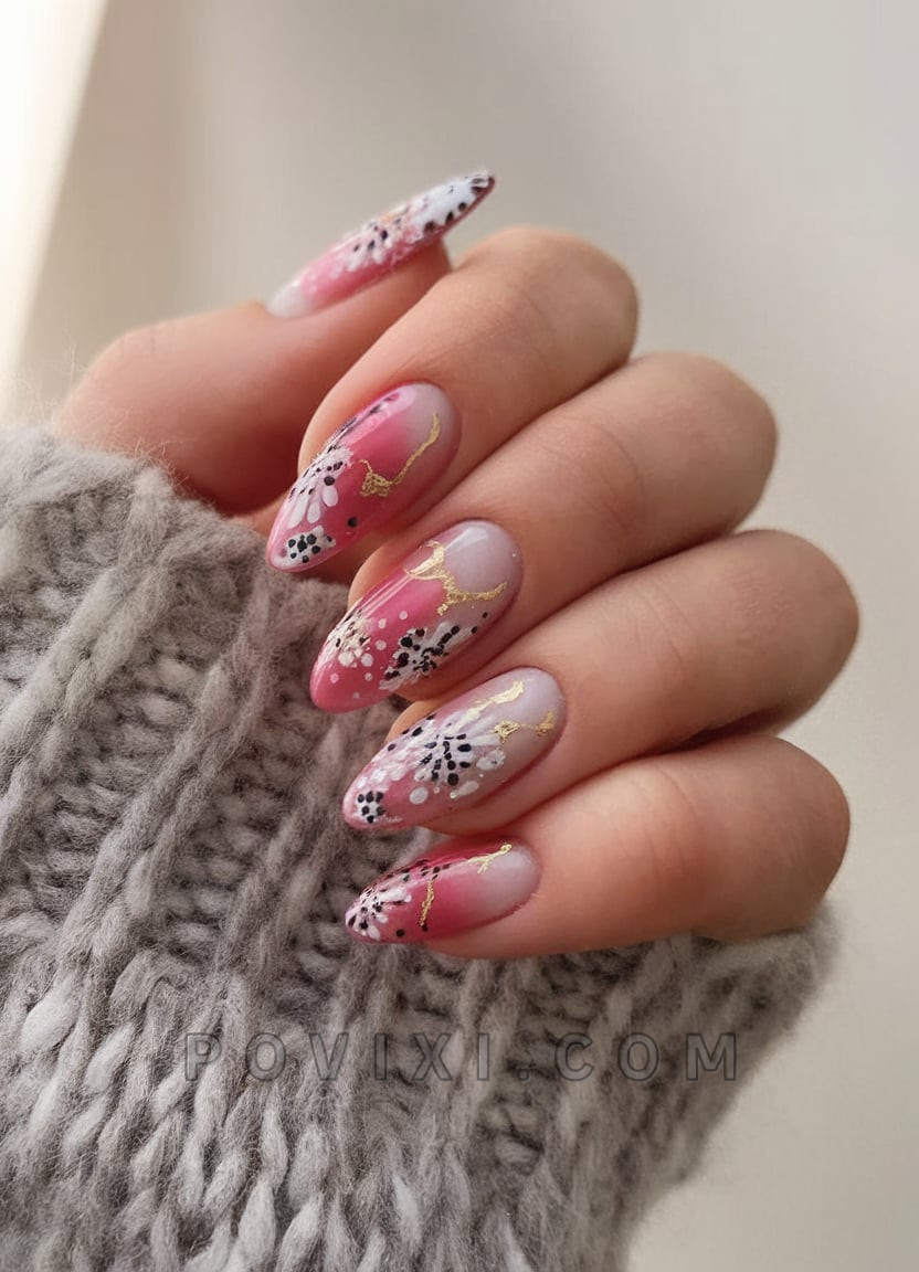 Floral elegance with a metallic twist. These almond nails are treated with an abundance of pink ombre before being embellished with delicate black and white floral elements and striking gold embellishments. This is a sophisticated design that would stand out at summer weddings and outdoor soirees. Be sure to save this elegant design for 2025, while we give thanks now.