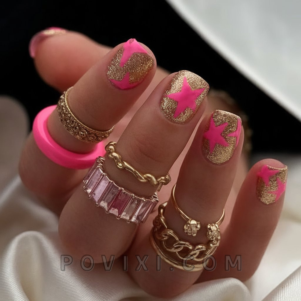 When in doubt, sparkle it up. The glitter nail design features gold glitter polish with neon pink star cutouts for a retro feel that stays fresh. The fun starburst elements of the artwork are combined with luxurious glitter shades. This set demonstrates an effective approach to transforming brief concepts into exceptional statement pieces.