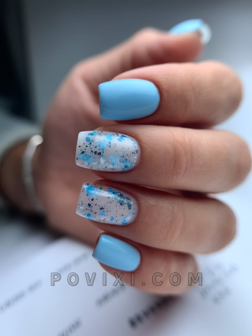 Eclectic navy blue patterns painted with shades of ocean sky blue combined with white splashes create a beachy power. A square-shaped nail design pairs beautifully with the artistic yet soft splatter patterns. This stylish manicure expresses oceanic beach enchantment especially for people who admire blue water reflections. Bright manicured nails glistening in the sunlight blend perfectly with a cool drink on a hot summer day while wearing colorful summer clothes.