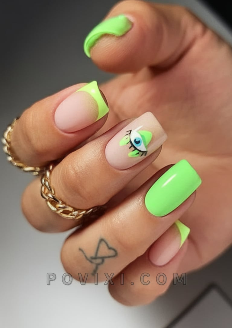 The latest nail set takes the french tip look to the next level by combining electric green tips with bold graphic eyes on an overall nude base. The mani design is for those who love creative, edgy artwork combined with fun details. This nail design is a perfect fit for the trends of 2025, as it meets both design protocol statements for trend-forward nail enthusiasts. The square nails create order through their shape, while the vibrant design expresses personality.