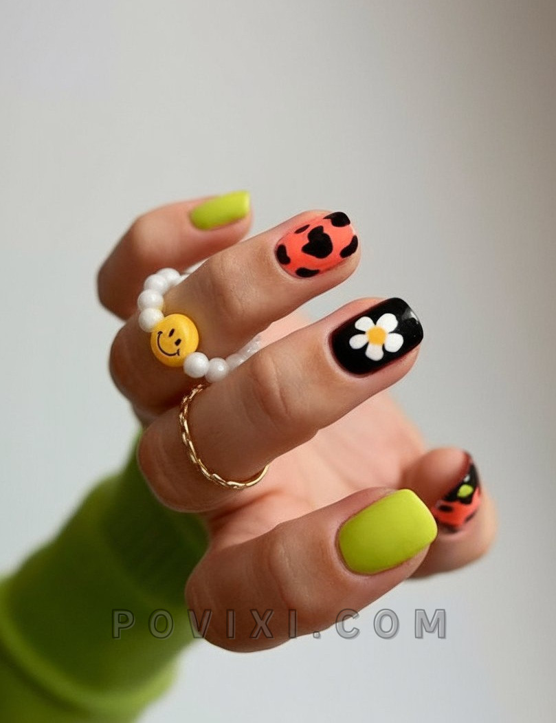 The playful manicure uses bold art elements that blend neon lime green with daisies painted on black and red-orange cheetah prints. This design is edgy because it conveys both expressiveness and a variety of distinct personality elements. The creative combination of sensory nail styles is one of the leading choices for the 2025 short trend because it highlights unique elements while maintaining practical wearability. These designs deliver an independent message, making them perfect for anyone who wants to make a statement about their summer feelings.