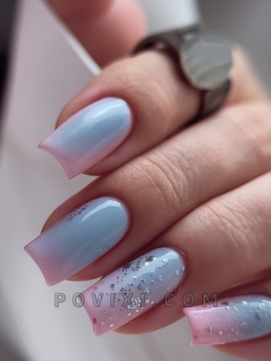 This summer’s perfect manicure features a simple ombre transition from blue to pink combined with silver glitter and finished with a pastel pink and blue blend. The square shape has enough distinctiveness to stand out, while its colors create a soft girly vibe. People who want an almond-shaped pink with cool, cloudy undertones will love this exact style. Elegant, airy and totally 2025.
