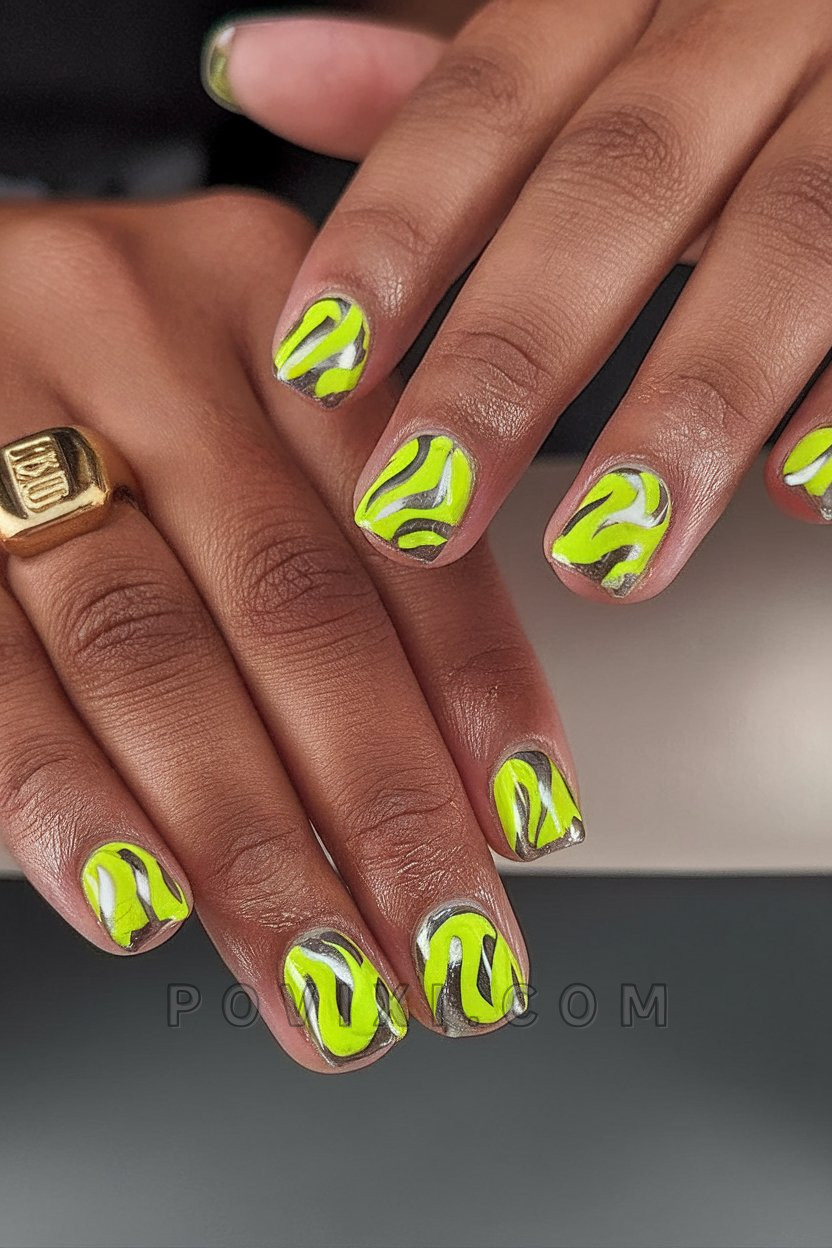 A top contender for 2025, this bold lime and black swirl pattern exudes unapologetic boldness. An edgy animal print meets futuristic elements with a high-gloss finish and silver chrome accents. The design works best on short nail lengths and works perfectly with square or oval nail contours to create an instant eye-catching look. Suitable for party nights or as a contrast to simple outfits, it is an unconventional upcoming trend that screams rebellion. Any vacation that calls for a statement look should use this approach as its definitive beach choice.