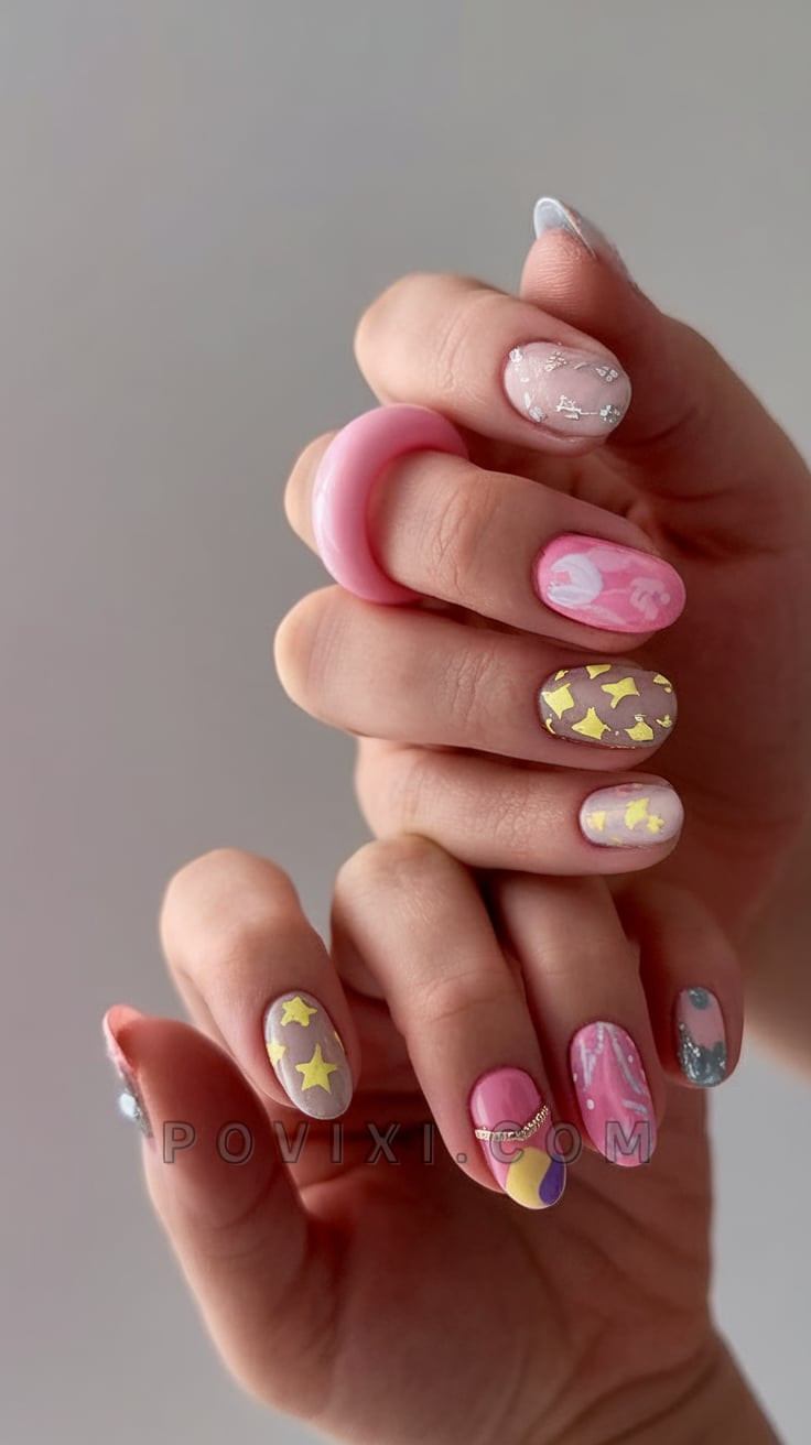 Here’s one for the daydreamers. The nail design blends pinks and lavenders with pastel blues and features foil stars and abstract artwork. Each nail in this arrangement creates a personalized story, making it ideal for people who need multi-color designs but want to avoid confusion. The artful touch blends all elements perfectly through its shiny top coat application that creates the perfect finish. Ideas Almond Shape Pink Users with oval or almond nail shapes should consider this attractive design as their first choice. The manicure maintains an attractive blend of adorable and sophisticated, working harmoniously with summer dresses, floral motifs and subtle shimmer effects.