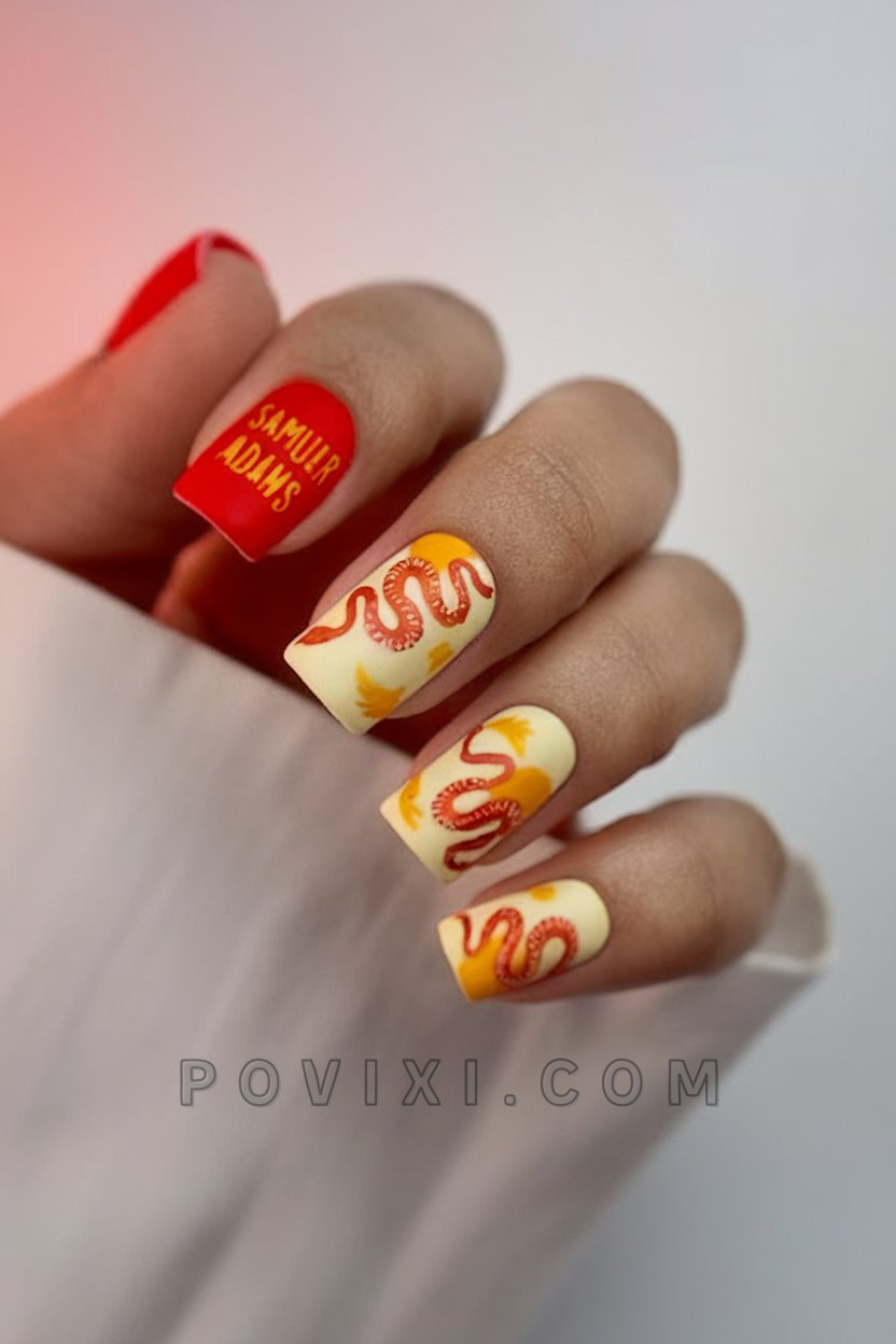 This funky matte red and creamy white and orange-yellow color combination embodies retro American fun while maintaining a private sense of amusement. The unusual aspect of this look comes from the stylized snake patterns next to the modern SAMU’IR ADAMS typography, creating an effect that blends cultural references with nail art. The graphic design elements add drama to the basic solid nail colors while maintaining their conventional appearance. When applied to square nails, this design will look its best at summer events such as barbecues, festivals and rooftop gatherings. Want to stand out? This eye-catching design is one of the trendiest ideas for short nails in 2025.