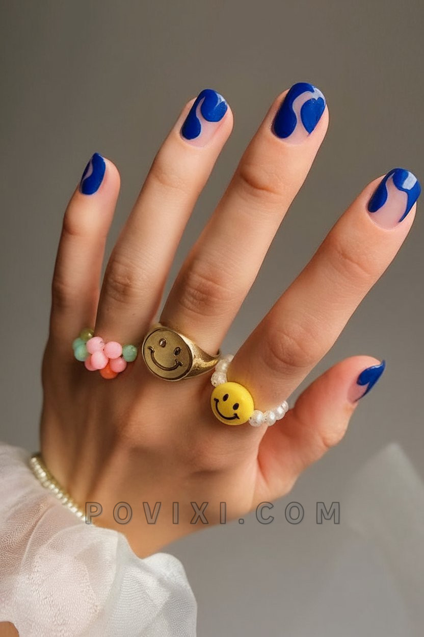 The abstract blue wave design presents a smooth, flowing aesthetic that demonstrates curated minimalism in every way. The combination of deep cobalt with negative space creates a striking style. This design creates an ocean atmosphere without any real symbolism, appealing to those drawn to contemporary minimalist art styles. Parents and teens should apply this design to short nails with round or oval shapes for a contemporary look that maintains ease of use.
