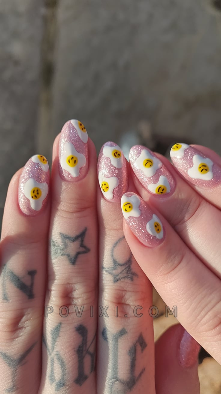 A cute set of rounded pink glitter nails with white abstract egg shapes and yellow smiley faces that make them irresistible. These nail designs combine a glitter effect with 90’s retro elements to secure a place in the Fun category along with the Ideas and Beach categories. This oval-shaped nail design remains simple yet innovative, making users question their manicure location.