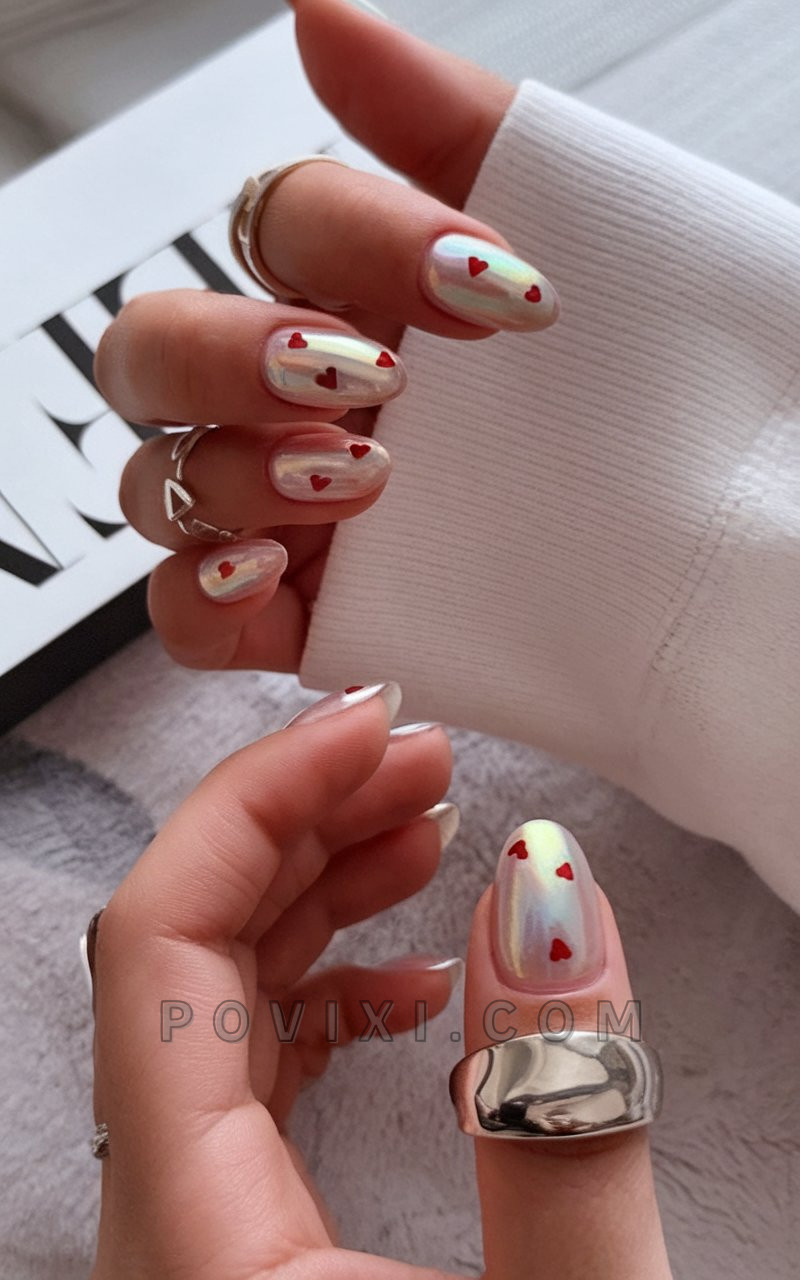 A shimmering pearlescent base coat with tiny red hearts creates opportunities for a magically elegant look that will stay in style forever. The elegant and sophisticated interpretation of Ideas 2025 can be perfectly executed with this romantic nail design suitable for executive events, weddings and romantic occasions by the sea. A slightly almond-shaped nail works best with this design, as it features a high-gloss chrome base that reflects light beautifully. The delicate design of simple elements shows how minimalism can achieve stunning appeal.