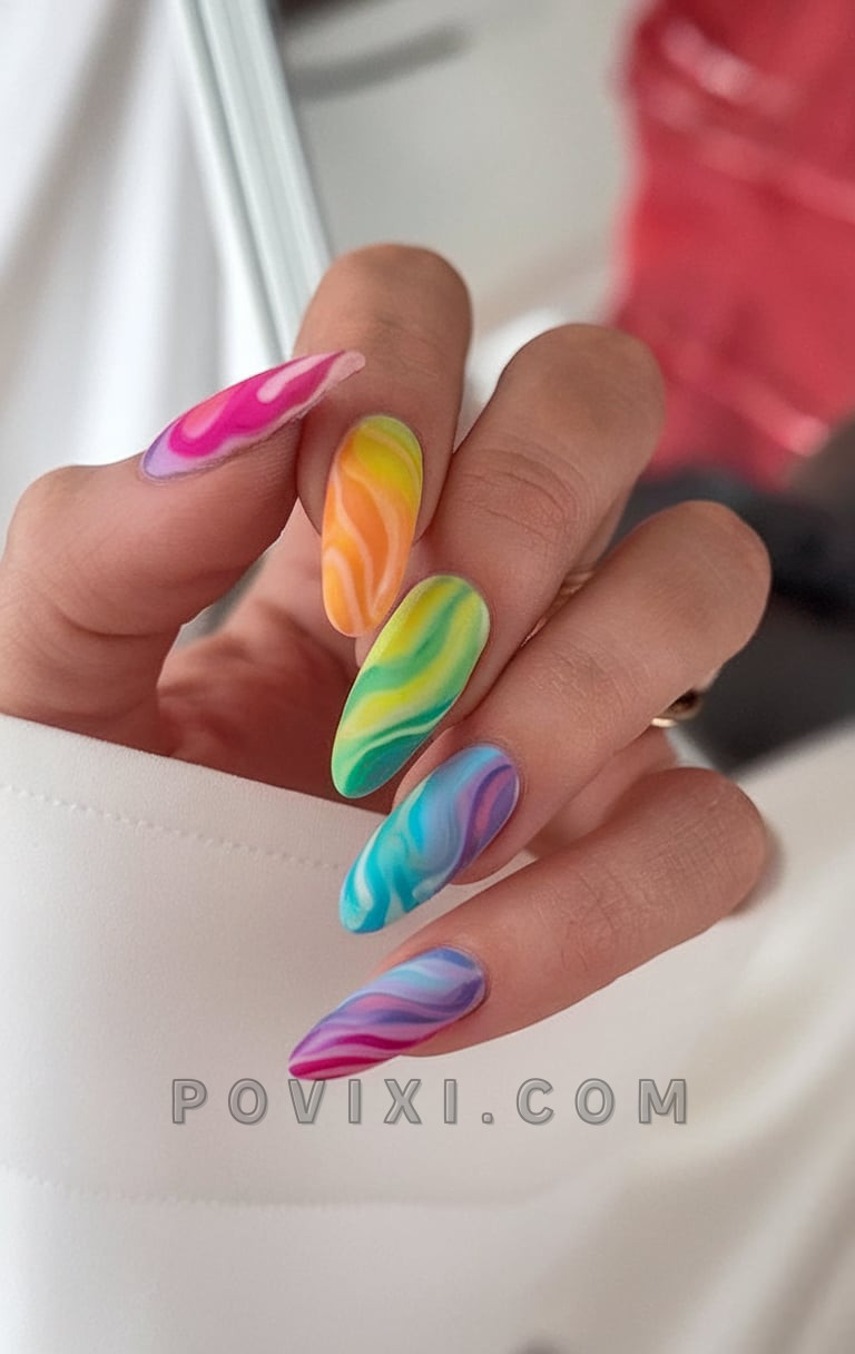 A rainbow manicure with a soft ombre color transition that creates the dreamy swirl pattern. The almond nail shape lends a sophisticated charm to this design, balanced by the liberated, free-spirited effect of the psychedelic swirl pattern. This special manicure embodies the style direction for 2025 and is perfect for summer festivals among imaginative people who love rainbow expressions. This design delivers a retro aesthetic with an artistic flair that creates an overall vibrant ambiance.