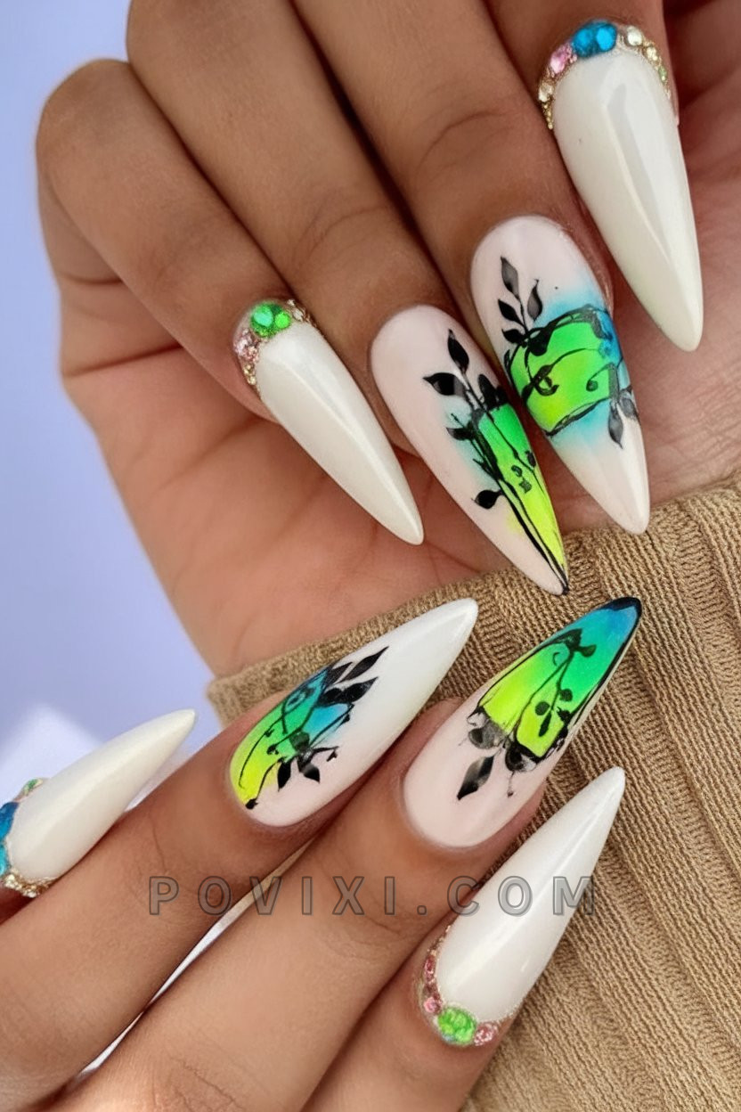 This design features an almond-shaped (almost stiletto) style based on white color while handmade vines dance across a magical transition from neon green to blue. The nail art design features strong visual power and a fusion of wild city style and outdoor plant elements. This nail design enhances botanical imagery through its mix of futuristic colors to give users a stylish yet edgy vibe. 2025 brings one of the most original nail art concepts for lovers of this creative field.