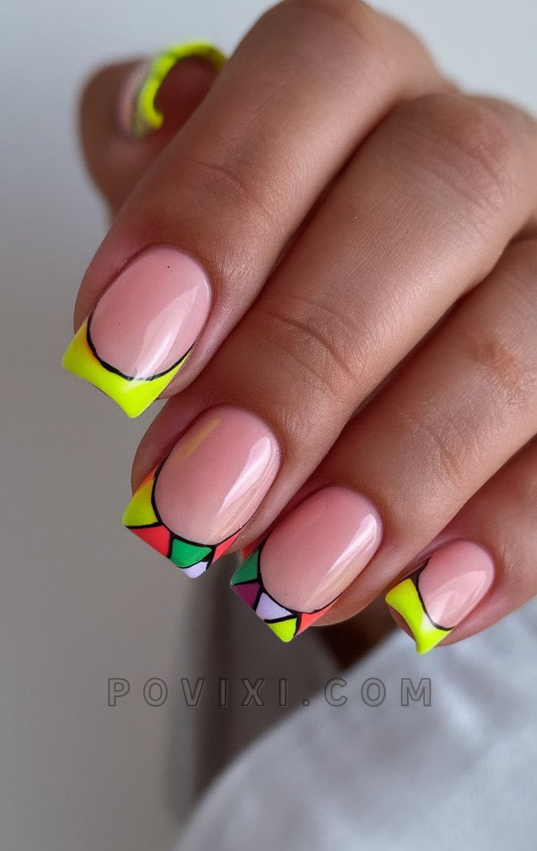 A basic nude base gets a retro makeover with geometric neon tips that add a playful touch to the simple color scheme. This sharp transformation of the typical short french tip look meets the squoval nail shape to create an up-to-date, contemporary result. This design caters to all preferences with color patterns and clean lines. The design is perfect for people who need professional polish but still want to have some playfulness in their nails.