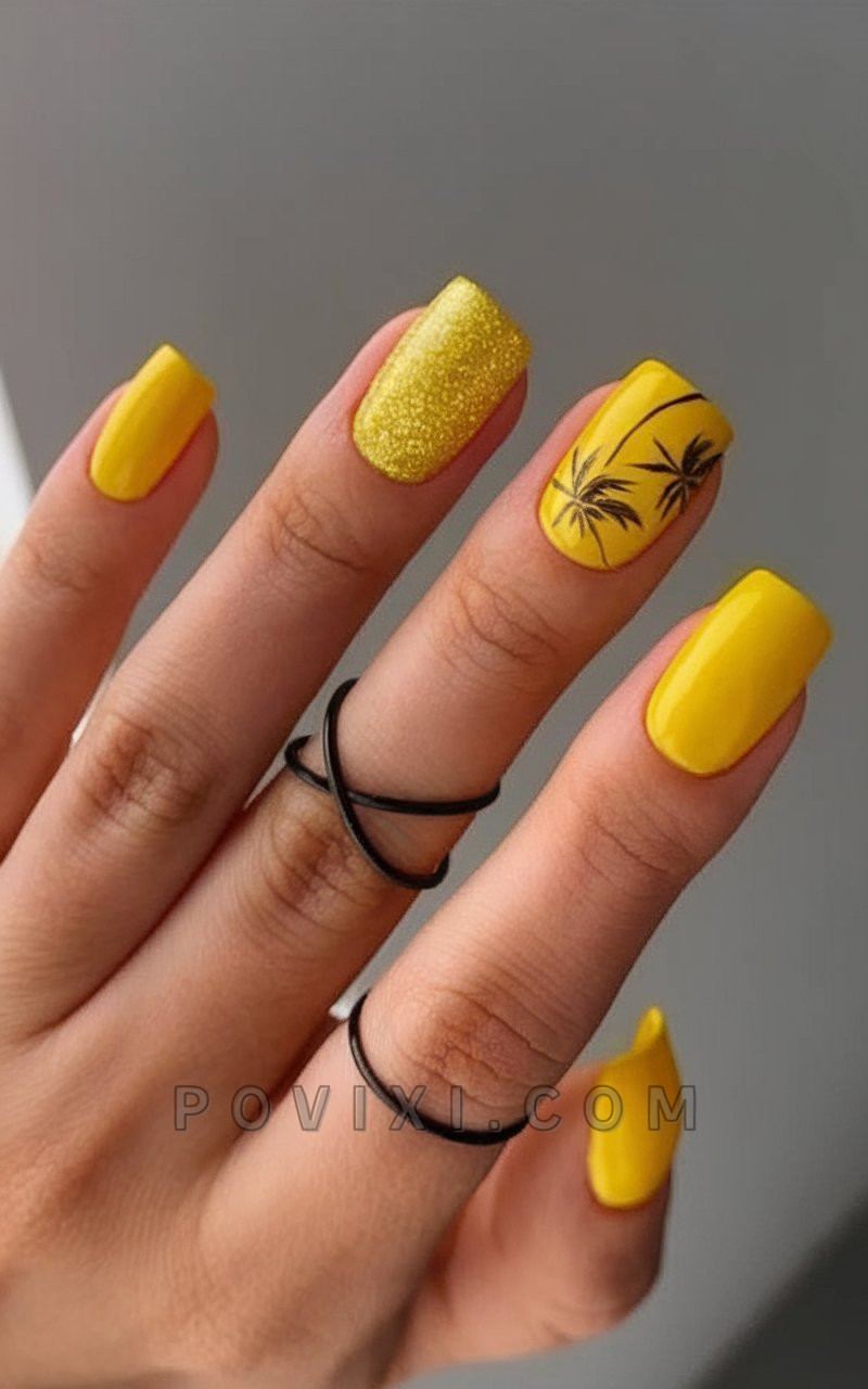 Hello, vacation nails! A solid bright yellow nail dominates the look, complemented by glitter and palm tree silhouette designs for an adorable beach experience on your hands. A solid monochrome design is showcased through delicate artwork that works well with beach themes as well as short designs. A square nail shape provides an elegant look and its summery yellow hue perfectly captures the essence of summer.