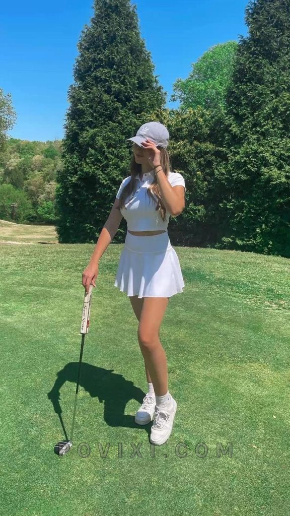 Pair this outfit with white sneakers and ankle socks for a polished finish. Accessories like a pastel pink handbag and retro sunglasses complete the aesthetic, making it perfect for a warm spring or summer day on the course. If playingl, consider layering it with a lightweight cropped jacket for added warmth.