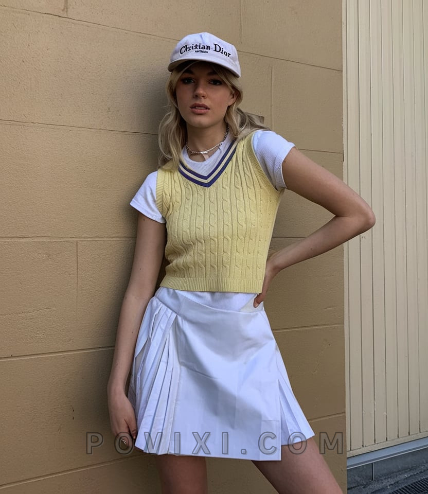 A vintage-inspired yellow cable-knit sweater vest layered over a crisp white polo, paired with a pleated white skort. This classy and preppy outfit gives a nod to traditional golf styles while staying fresh and contemporary. Complete the look with a branded cap and dainty jewelry for a refined, elegant touch. Perfect for a relaxed round of golf followed by brunch at the clubhouse.