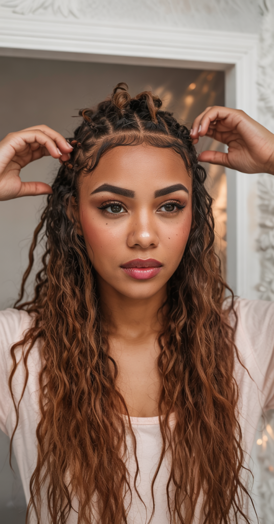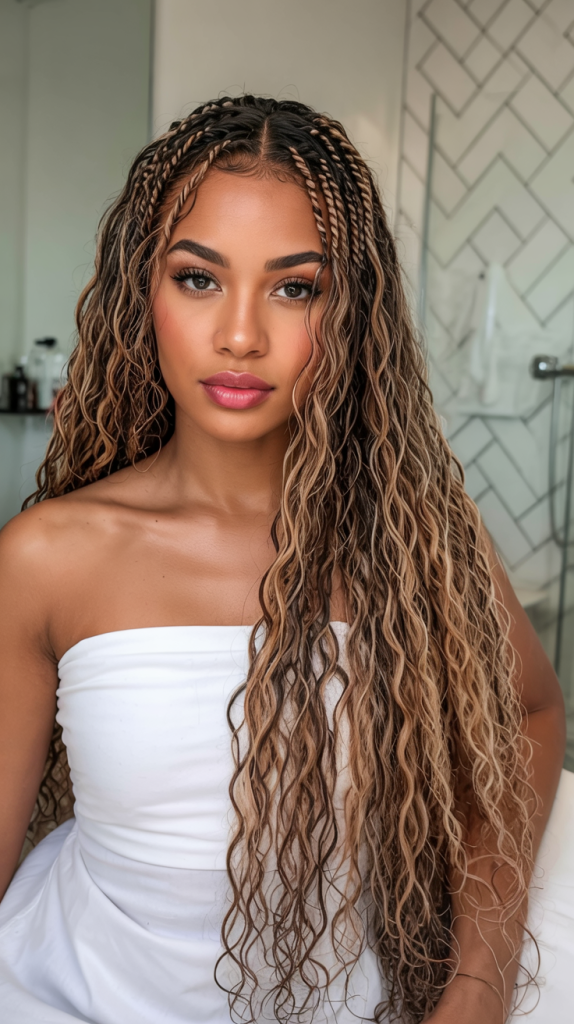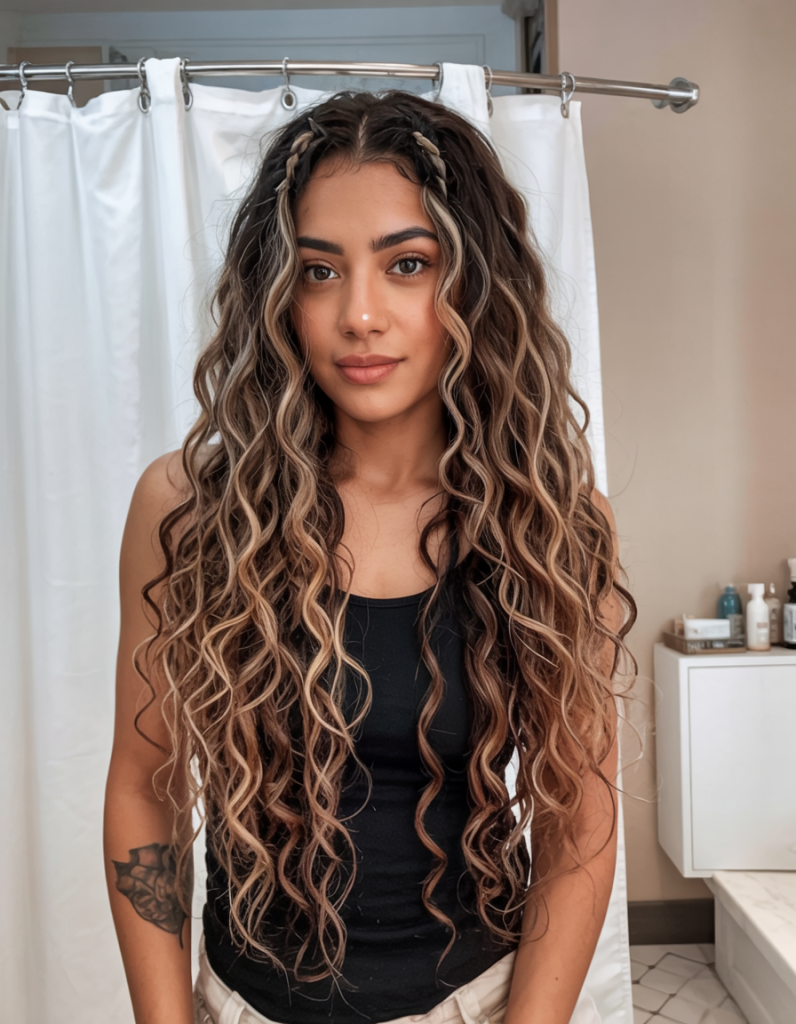 This appearance glows with light and assurance as blonde-topped twists flow into waves of length. It is a style that is less tough but still romantic but loud-like so that people can notice it. The simplicity of the defined tops contrasts to the cuteness of the free waves at the bottom conveying a youthful, fresh effect.