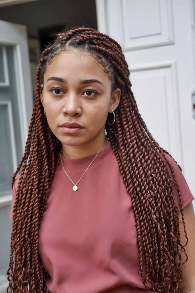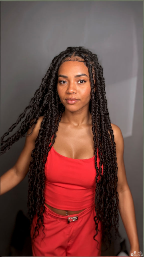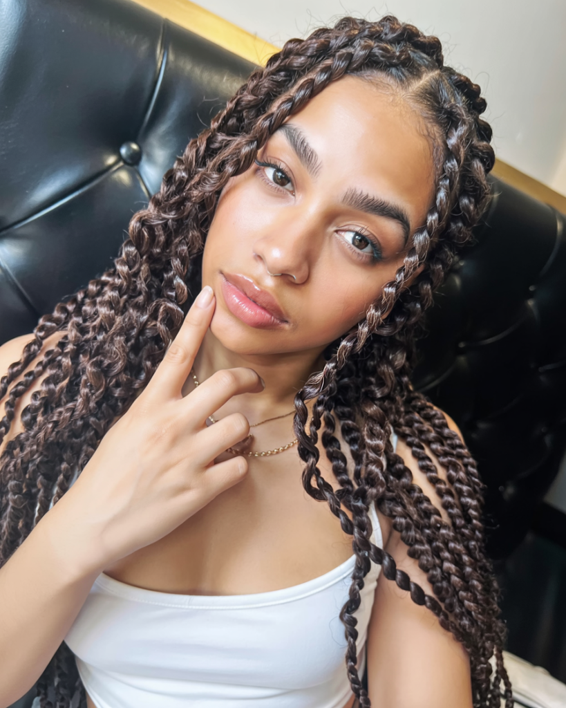 These giant jumbo island twists are bold and dramatic and they can be a statement when you enter a room. Their potency lies in thickness and adds body and weight whilst the natural black color keeps them classic and universal. It’s a hairstyle that radiates confidence and grounded energy.