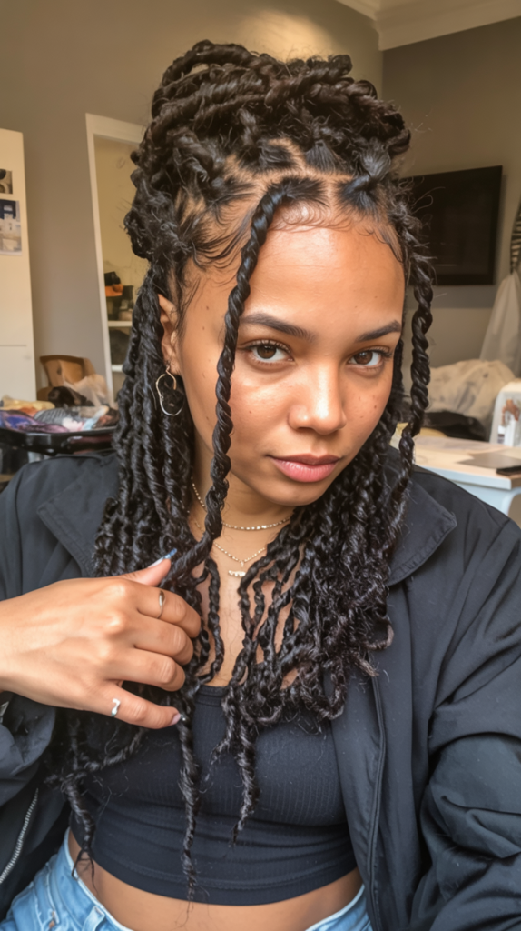 This is a look that channels clean precision: defined twists with a smooth middle part. The strands are simple but orderly giving it a classy feel that is timeless. It is an unpretentious yet authoritative appearance that does not make any extravagant efforts.