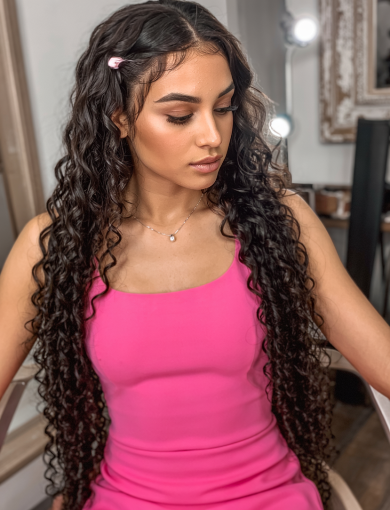 Fun character, this half up look is gathering all the island twists and big voluminous curls at the bottom. The curls around the head are intersected with the structured braiding on top contrast to the bouncy curls at the bottom creating the effect of movement in the style. It is romantic and daring as well, which makes it a perfect choice, in case someone enjoys playful elegance.