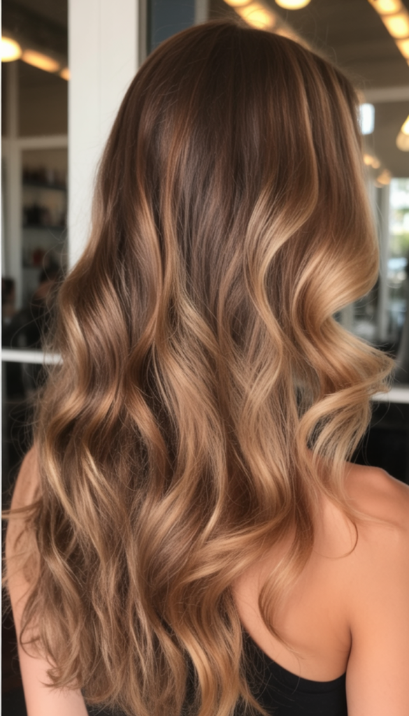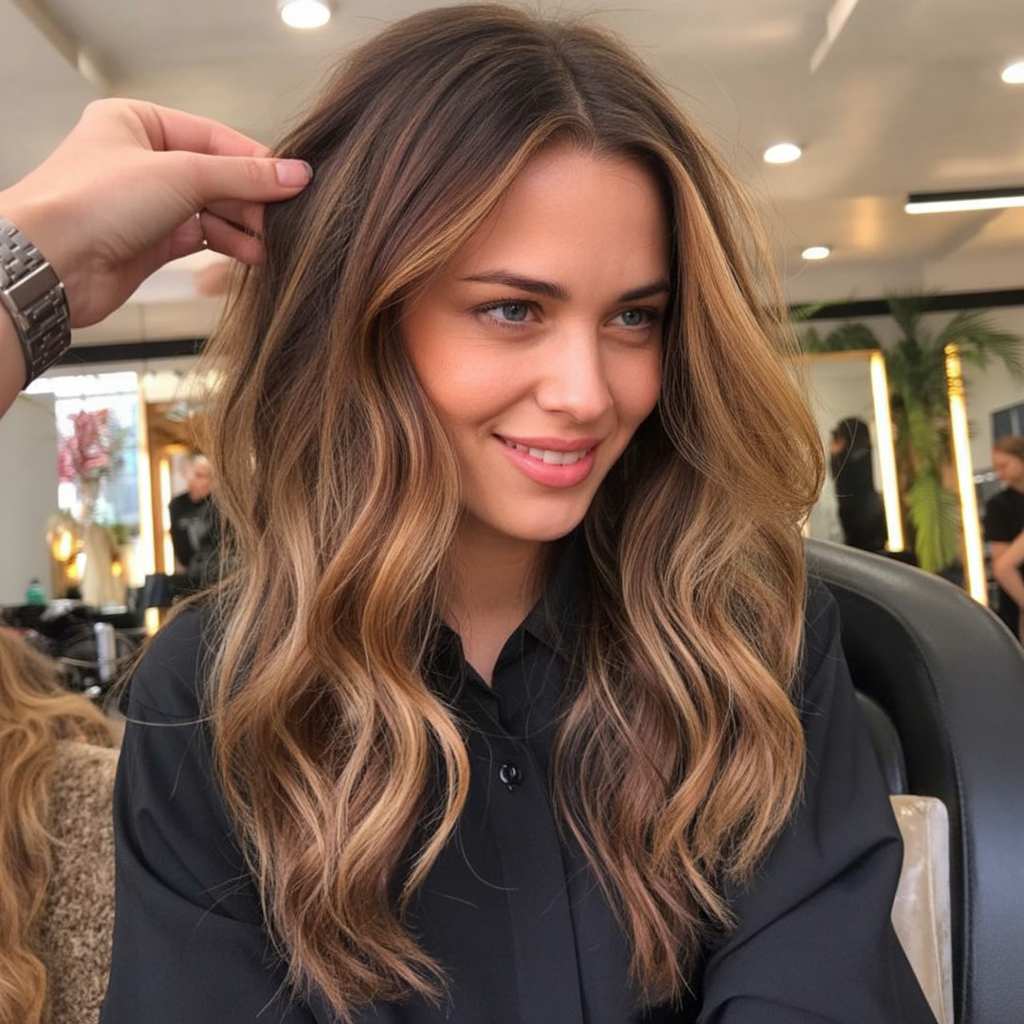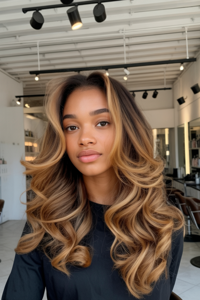 This style works best for women with long hair, preferably having a natural wave or curl pattern. It’s easy to maintain, as it requires a light curl at the ends, coupled with a smoothing effort at the crown for a balanced look. Further added highlights of caramel at the lower levels create a dimension, ensuring that the waves look great as they move with lighting.