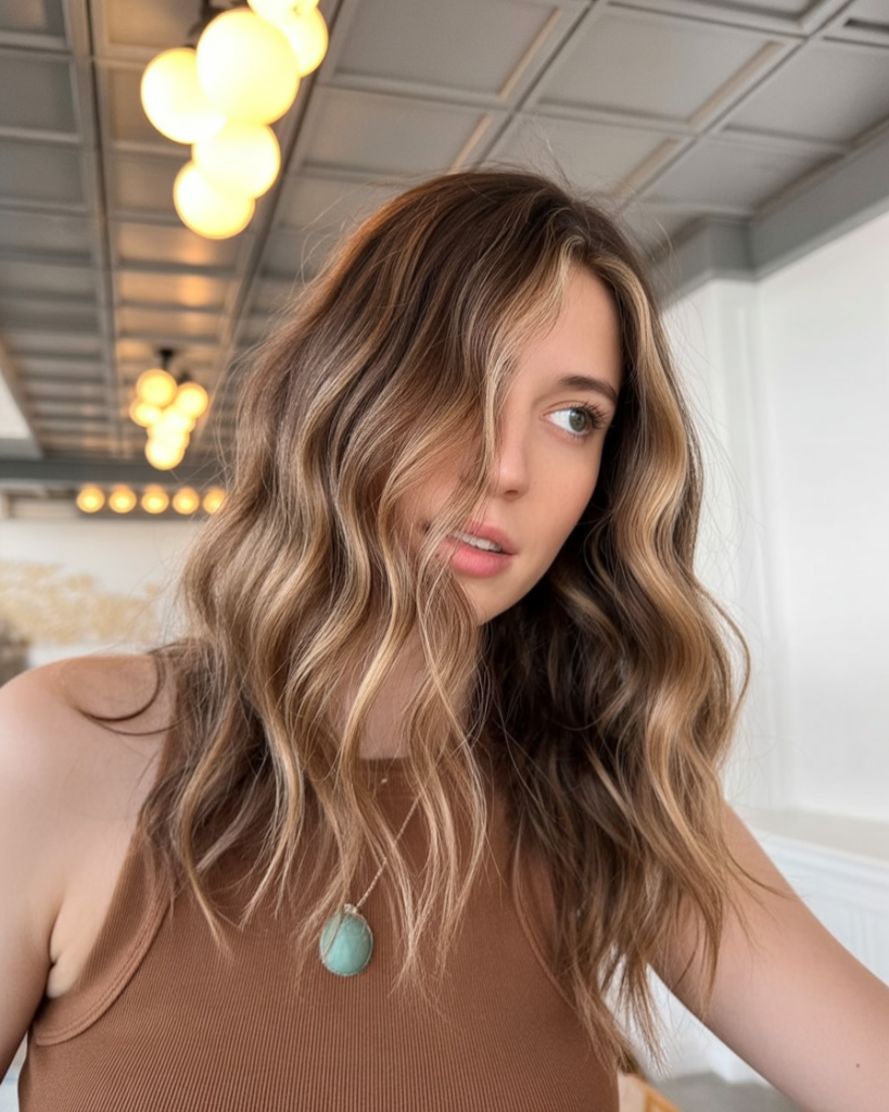 There’s a certain undeniable charm about having a light brown, softly waved hairstyle with pieces of light blonde hues strategically woven in. It has a great, effortless look, as its cascading waves perfectly encapsulate facial features, giving it that ideal ‘just-stepped-out-from-the-beach’ look.