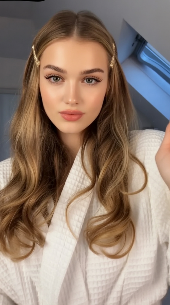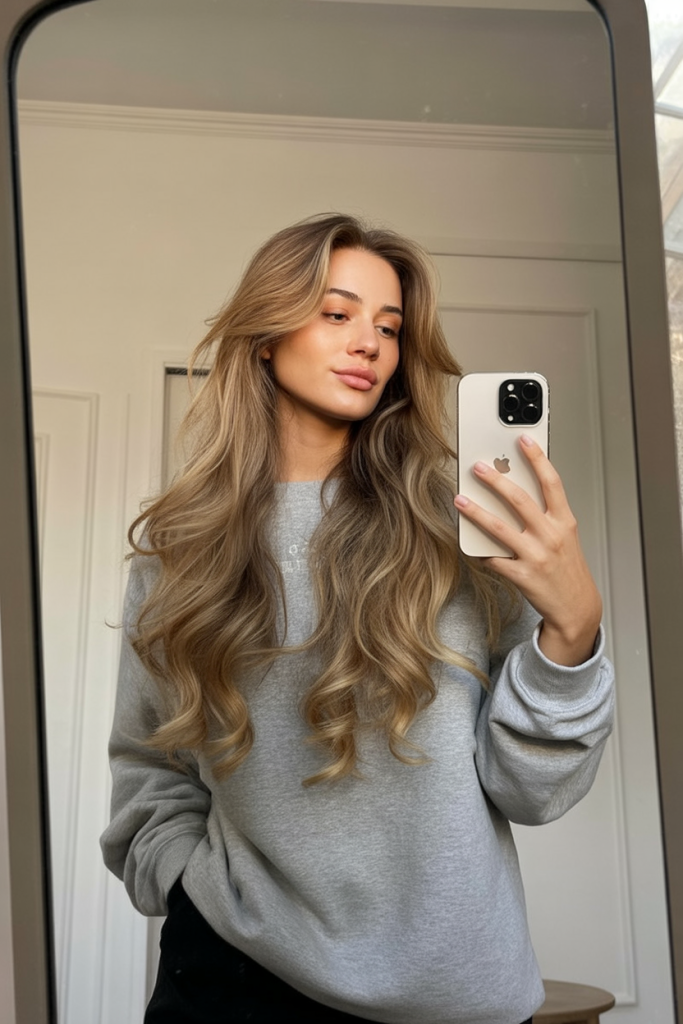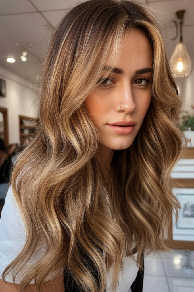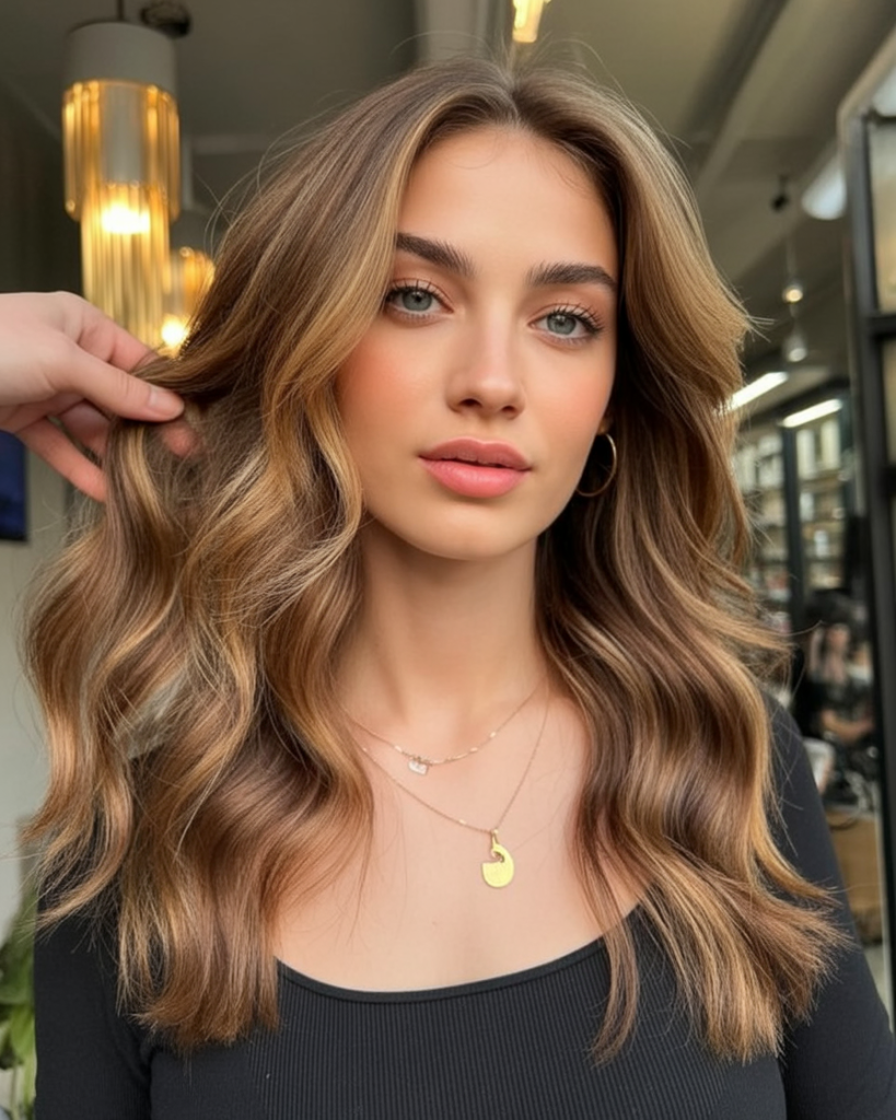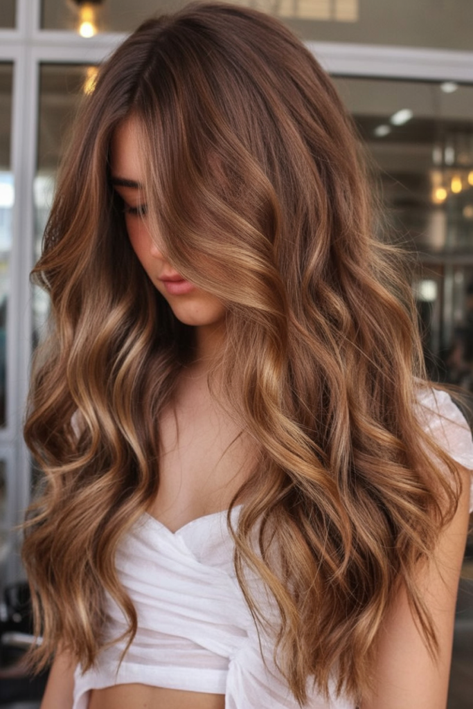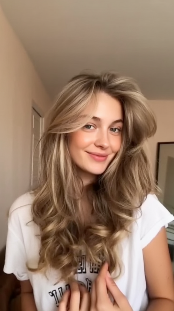 There’s something so romantic about a middle part with flowing, natural waves. This light brown style, accented with subtle golden reflections, frames the face softly while keeping the overall look fresh and youthful. It’s understated but in the most captivating way, making it perfect for women who like their beauty to feel effortless.