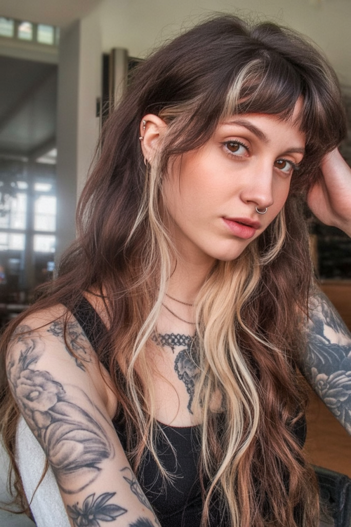 Modern and edgy, the two-toned shag melds warm brunette colour with exuberant blonde face-framing locks. The baby bangs gives it a fun yet daring touch and therefore they are suitable to someone who enjoys being dramatic.
