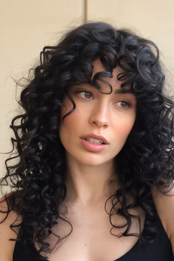 This style works awesome on wavy curly hair or thick wavy hair and provides even shape and movement without making the whole thing too elaborate. To style, some mousse and a diffuser will add a little bit of texture and bangs straight will keep the rest of it fresh and face-focused.