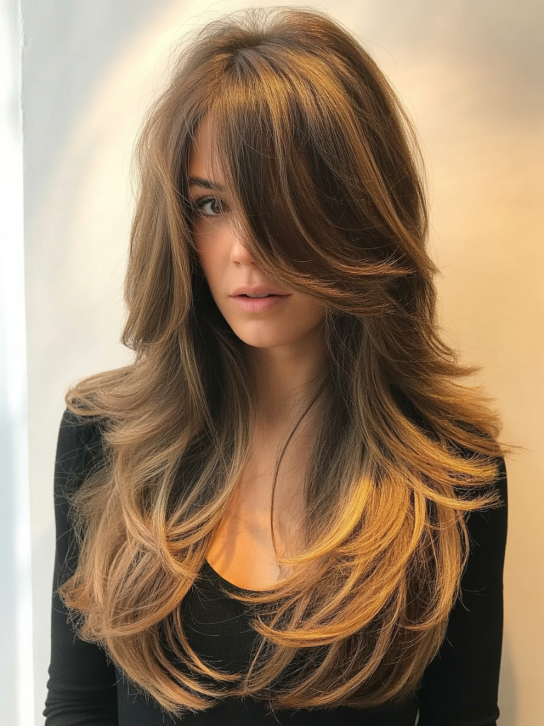 This is a very long voluminous shag that is sheer elegance but with a playful ring to it. The layers interspersing on top of another make a silky effect of the waterfall and the curtain bangs part softly to bring out the eyes and the cheeks. The rich golden-bronde coloring provides warmth and depth, so it can be classified as the type of style that draws attention when one enters the room.