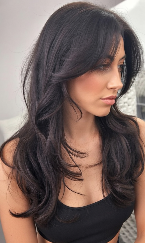 This effortless shag embraces natural wave and flow. The light layers and curtain bangs on the style especially keep the style modernization without losing the length, but the richness is introduced by the dark glossy color.