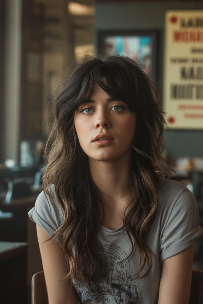 The look is unnecessarily cool: easygoing and flirtatious, it oozes an almost-confident casualness. The front bangs are full and introduce a mystery factor at the same time but the loose layers help to maintain the natural form of the hair. The style of haircut is what makes you feel you have just left a cool cafe in the center of the city.