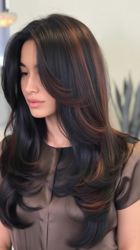 It is a textbook lesson in mass and flow. The layers are skillfully trimmed into a voluminous, bouncy appearance and the face-framing falls are soft so as to bring focus on the eyes. The rich, warm tones make it even more radiant.