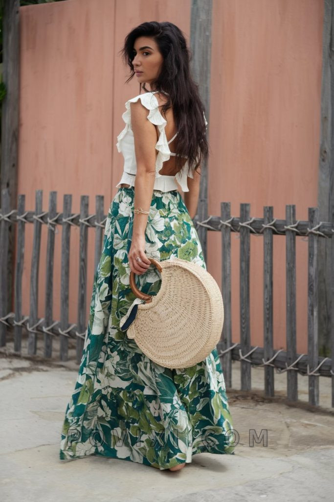 A summer wardrobe isn’t complete without a floral maxi skirt. This look embodies a casual style with a romantic touch—perfect for a seaside getaway or a garden party. The vibrant green and white print exudes freshness, while the cotton ruffled top adds a feminine flair. A woven handbag and strappy sandals complete the outfit, making it effortlessly chic. Opt for lightweight fabrics like cotton or linen to stay cool during hot days. A modest but stylish option for a summer evening. This outfit is perfect for a tropical vacation, an outdoor wedding, or even a sunset picnic by the beach. The flowy silhouette adds a dreamy effect, making it ideal for capturing Instagram-worthy moments.
