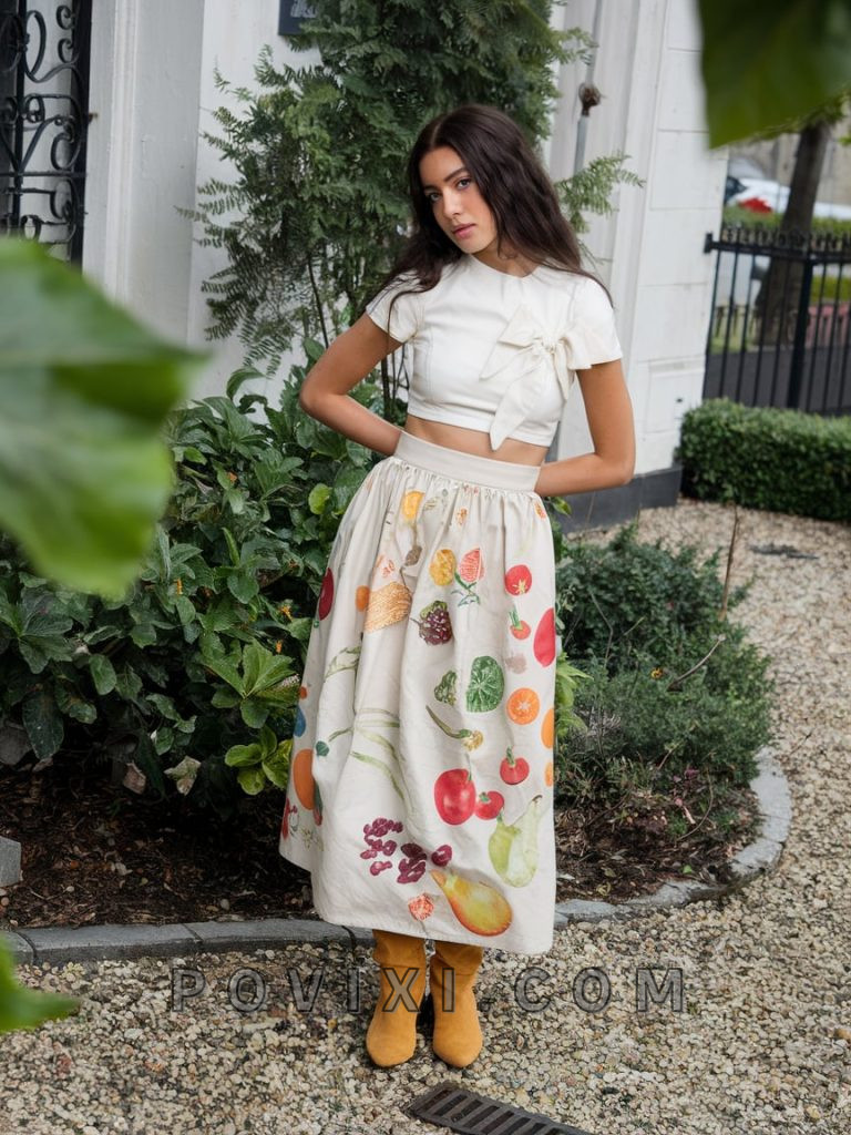 For a casual and eclectic look, this printed A-line skirt styled with a fitted tee and cowboy boots makes a fun summer outfit. The whimsical design brings a cute and artsy touch to the ensemble. Try pairing with a denim jacket for cooler evenings. Fun choice for summer festivals, road trips, or outdoor fairs.