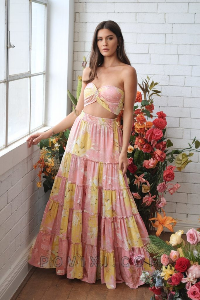 Vibrant, printed co-ords are making waves in 2025. This striking duo of a bandeau top and a tiered maxi skirt in abstract pastel hues showcases the perfect outfit theme for tropical destinations. The mix of pink, orange, and yellow enhances the summer glow, while the flared skirt adds an ethereal movement to the outfit. Complete this no vip outfit with strappy sandals and minimal accessories for a fresh, runway-worthy appeal. If you love layering, a lightweight white kimono or cropped blazer can add an extra touch of elegance.