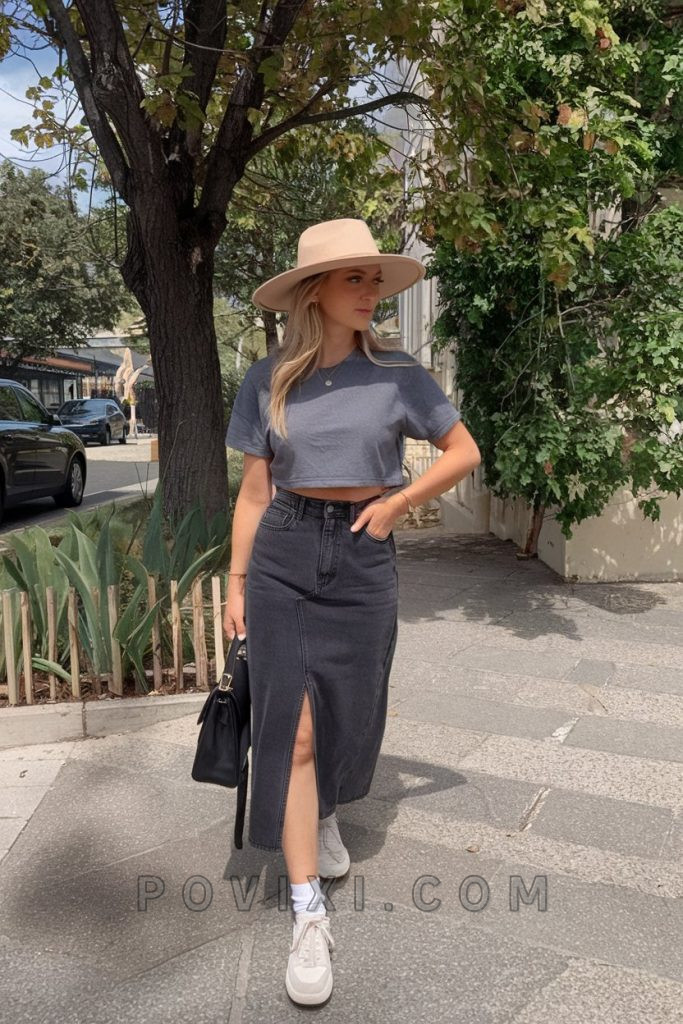 An edgy take on outfit ideas, this no vip outfit features a black high-slit denim skirt paired with a cropped gray t-shirt. The addition of white sneakers gives it a sporty edge, making it an ideal look for city strolls. A wide-brimmed tan hat and a structured handbag bring balance to the casual brat-inspired aesthetic. Combos like this one allow you to mix and match essentials without sacrificing style. For a more polished approach, switch the sneakers for heeled ankle boots and add a statement belt to cinch the waist.