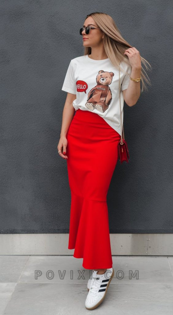Bold yet casual, this look features a graphic tee tucked into a striking red high-waisted maxi skirt. The standout element? The effortless mix of no vip and sporty aesthetics with white sneakers. The pop of color makes this outfit theme a statement-maker, while the relaxed top keeps it grounded. Ideal for casual summer outings, this cute ensemble is comfortable and trend-forward. If you want a sleeker appearance, knot the tee at the waist and swap the sneakers for wedge espadrilles.