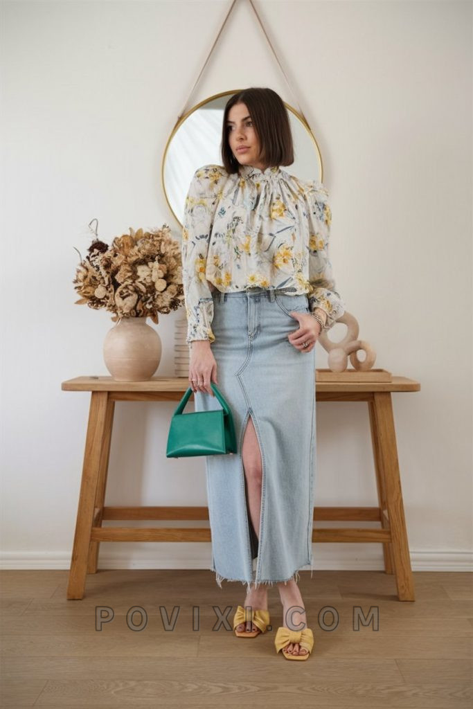 Pairing a floral blouse with a front-slit denim skirt creates an effortlessly chic outfit theme. The flowy top with delicate floral prints adds a feminine touch to the structured denim, while gold-embellished sandals and a bright green handbag bring in contrast. Perfect for weekend brunch or garden parties, this free-spirited yet sophisticated outfit idea embodies timeless summer elegance. Layering this outfit with a cropped cardigan or a neutral-toned blazer makes it perfect for cooler evenings.
